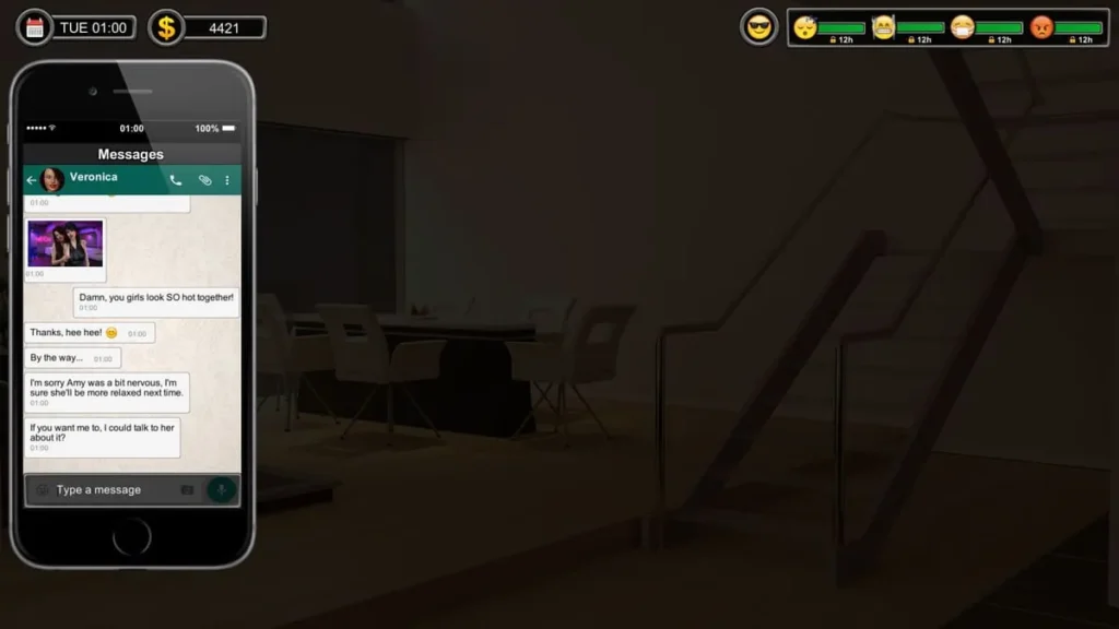 | Submission | 100 | Commands (via the “I want to tell you something” menu), imposing punishments, assigning housework, and dominant dialogue choices. This is especially key for characters like Veronica. | Unlocks dominant/submissive interaction paths, control over daily activities, and unique scenes focused on power dynamics. |